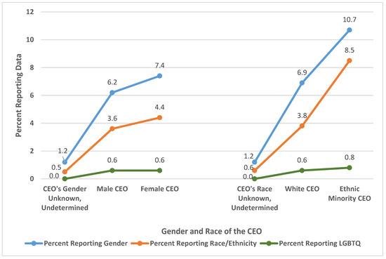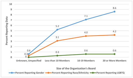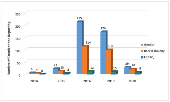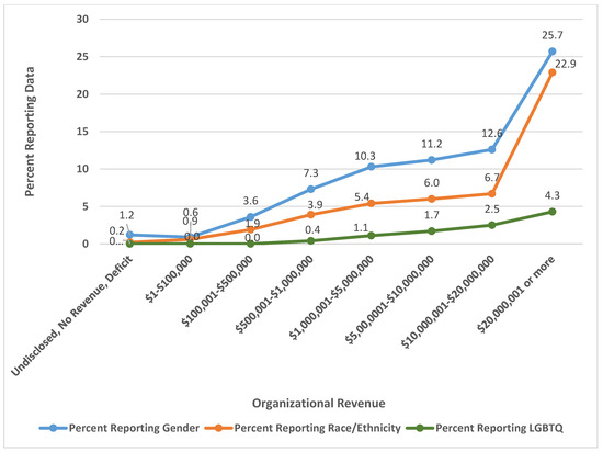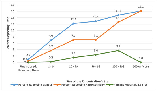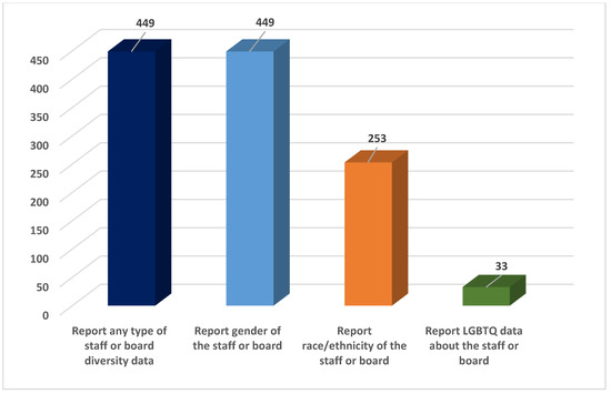 Figure 3 indicates that organizations are more likely to reveal their gender diversity data than either their racial/ethnic or LGBTQ data. While all 449 organizations that disclosed demographic data revealed gender data, only 253 or 56.3% of those disclosing diversity data reveal racial data. A much smaller number and percentage revealed LGBTQ data. The figure shows that only 33 organizations or 7.3% of those reporting diversity data divulge LGBTQ data. However, the LGBTQ data might be an undercount as GuideStar only shows the LGBTQ data for organizations that have 15 or more employees. GuideStar does this “to protect the identity of individuals” [35]. Hence, organizations with smaller staff might have disclosed LGBTQ data, but that information is not relayed to the public by GuideStar’s management. GuideStar uses the same policy to guide the disclosure of disability data. This study did not assess the revelation of disability data because few organizations revealed this data.