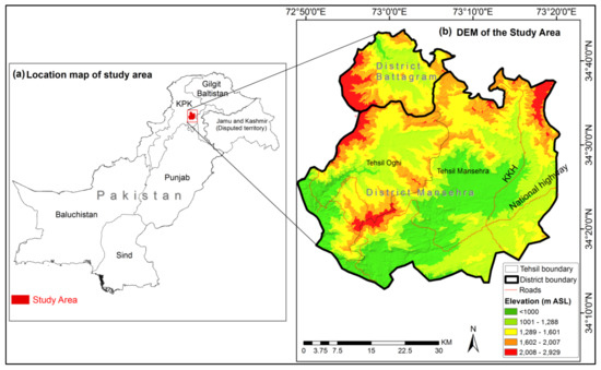 (a) The study area’s (i.e., Mansehra and Battagram districts) location in Pakistan; (b) elevation map of the study area along with major roads.