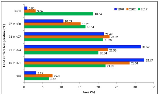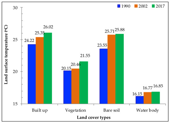 Our study found that built-up areas had the highest land surface temperature followed by bare soil, vegetation and water. Similar findings were reported by [64] who assessed the LULC impact on the land surface temperature in Zhujiang (China), in order to assess LULC and thermal signature relationship. These outcomes were similar to [66], who found that bare soil and built-up area had a higher LST as compared to water bodies and vegetation categories. The current study showed that the LST regimes expanded due to conversion of vegetative surfaces into non-vegetated areas. The findings of the current study also indicated that LST increased for all LULC classes from 1990 to 2017 (Figure 3 and Figure 5) which was probably due to global warming and surface modification. According to Terando et al. [67], LST could increase when urban expansion cascaded with climate change [68]. Similar findings in the lower Himalayan region were also reported [28]. The increase in LST in the study area was higher due to speedy urbanization from 1990 to 2017. Another fact, such as different temporal resolution of Landsat images could contribute for the LST increase beyond the built-up area; however, the outcomes showed that the area was affected by both local warming and/or climate change.