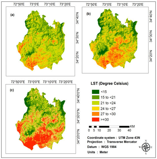 The land surface consists of vegetation, water surfaces, impervious surface materials, soil and rocks. The higher trend of land surface temperature of urban areas was due to impervious surfaces which contribute towards the formation of an urban heat island (UHI) [7]. Tropical and sub-tropical climate urban areas LST depend on LULC, where built-up areas have the highest LST in comparison with arid environments in which bare soil had the highest LST [8,9]. Urban warming increased air temperature in the Himalayan region by affecting humidity and temperature of the lower boundary layer of air [10,11]. Also, the increase in LST regimes would cause the formation of an UHI [12]. The urban areas were projected to increase as they occupied only 3% of total land cover in 1950 but expected to cover 66% by 2050 [13] globally. Such rapid urban expansions may replace vegetation with built-up areas which increases LST. This results in UHI creation in urban areas of the world [14,15,16].