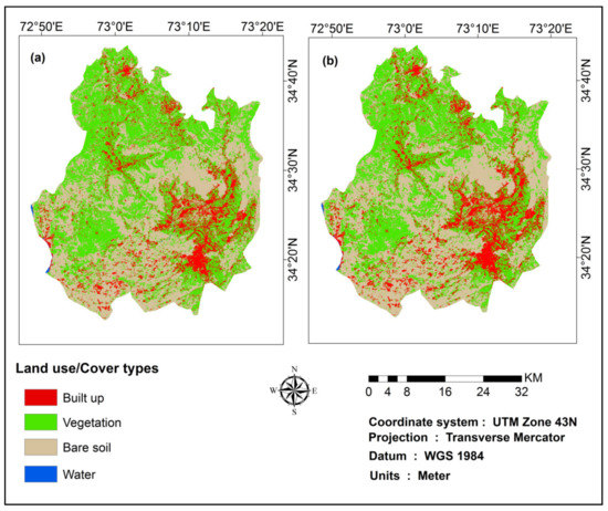 Modeled LULC for the study area for (a) 2032 and (b) 2047.