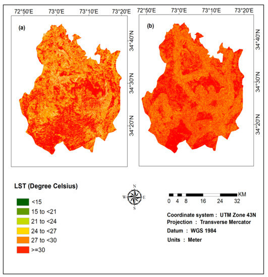 Modeled LST for the study area for years (a) 2032 and (b) 2047.