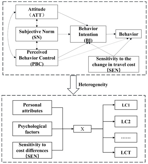When studying the mode choice behavior of travelers, the individual attributes and psychological factors of different travelers affect their preference of mode choice. Suppose there is a potential variable X that represents travelers’ preferences for different travel modes. Obviously, each traveler has different preferences, however, travelers with similar preferences can be grouped into one category. Although it is difficult to measure individuals’ travel preferences directly, it can be seen from the above analysis that there is a complex statistical correlation between traveler preference and traveler attributes, attitudes, subjective norms, perceptual behavior control, sensitivity to utility difference between modes, and other psychological factors. Therefore, a traveler’s attributes, psychological factors, and sensitivity to the utility difference between modes can be taken as explicit variables to establish a latent class model, as well as to further subdivide travelers into different categories and explore the heterogeneity of traveler mode choice behaviors.