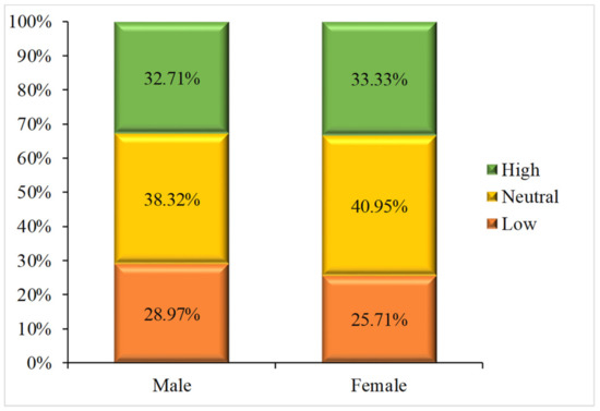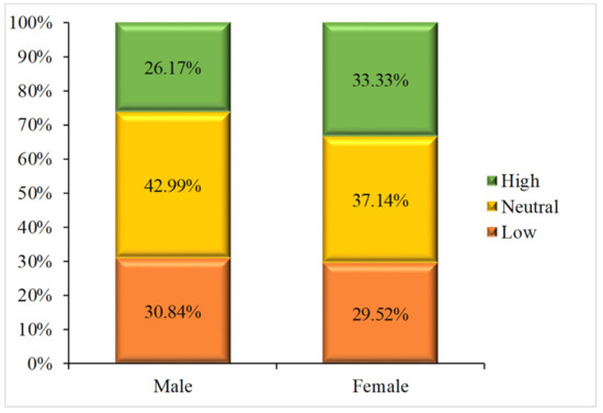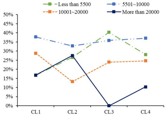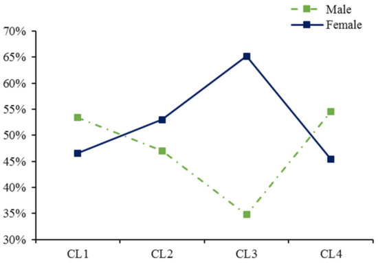 It can be seen from Figure 11 that, in the CL3 category, the proportion of female travelers is relatively high, while in the other three categories, the proportion of male travelers and female travelers is similar, which is close to the gender distribution of the survey samples.