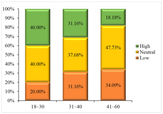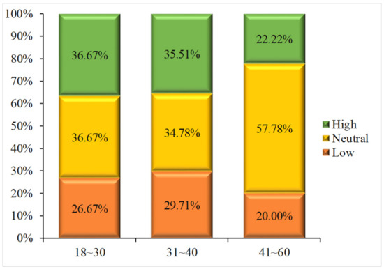 The sensitivity of travelers of different ages to changes in travel cost is shown in Figure 4 and Figure 5. According to the survey results, travelers aged 18 to 30 have the highest sensitivities to changes in time-cost and expense-cost, followed by travelers aged 31 to 40. Conversely, travelers aged 41 to 60 have the lowest sensitivities.