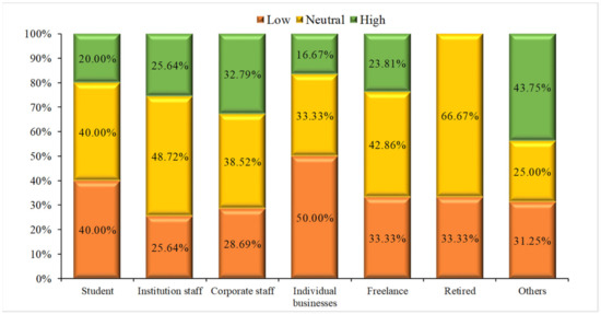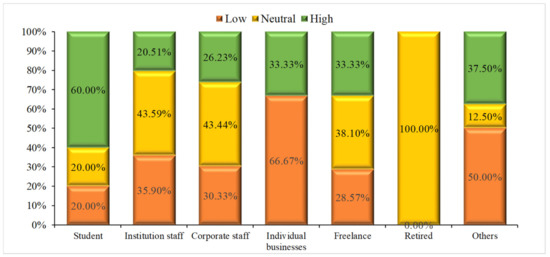 The sensitivity of travelers with different occupations to changes in travel cost is shown in Figure 6 and Figure 7. According to the survey results, among the respondents, students were the most sensitive to changes in expense-cost, while the staff of government and public institutions and enterprises were the most sensitive to the changes in time-cost between modes.