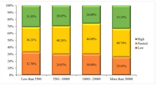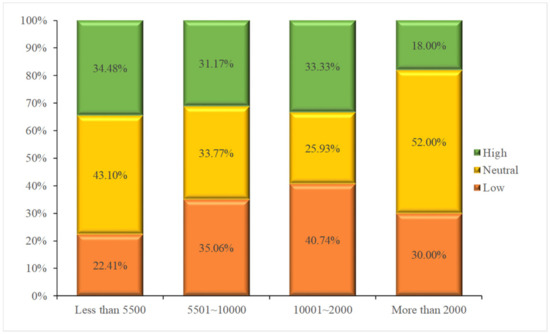 The sensitivity of travelers of different incomes to a change in cost is shown in Figure 8 and Figure 9. According to the survey results, among the respondents, high-income travelers with a monthly income of more than 20,000 have the highest sensitivity to changes in time-cost, while their sensitivity to a change in expense-cost is the lowest.