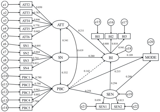 The Cronbach’s alpha coefficient (α coefficient) was used to test the reliability of the questionnaire to determine whether the measurement items are highly consistent with the variables. It is generally believed that, when , the consistency and the reliability is high; when , the consistency and the reliability is acceptable; and when , the consistency and the reliability is low. The reliability test results showed that the Cronbach’s alpha coefficients of ATT, SN, PBC, BI, and SEN were 0.853, 0.895, 0.929, 0.908, and 0.691, respectively, indicating that the variables had good internal consistency.