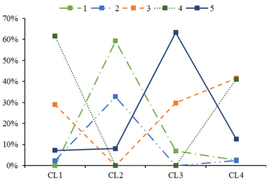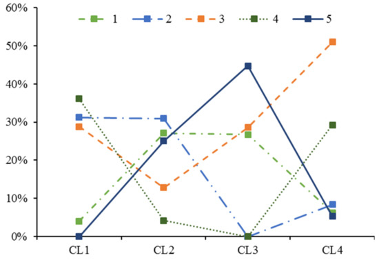 As can be seen from Figure 14, the influence of media and public opinion on CL3 travelers is polarized. Here, 44.7% of CL3 categories have a score of 5, while 26.7% have a score of 1. The rest are neutral. Among the CL2 travelers, 25% of the travelers scored 5, 27.1% of the travelers scored 1, and 30.9% of the travelers scored 2. The overall evaluation was low, suggesting that the CL2 category was not easily affected by media and social public opinion. CL1 mainly focuses on scoring 2, 3, and 4, which are evenly distributed. Similar to CL1, CL4 mainly focuses on scoring 3 and 4, which are mostly neutral.