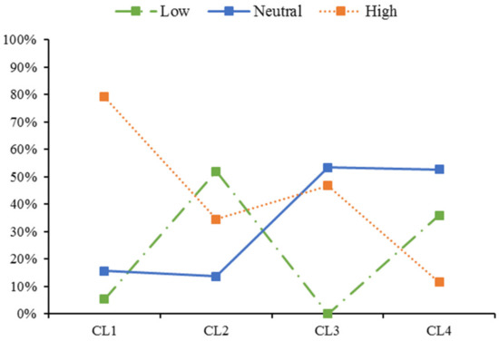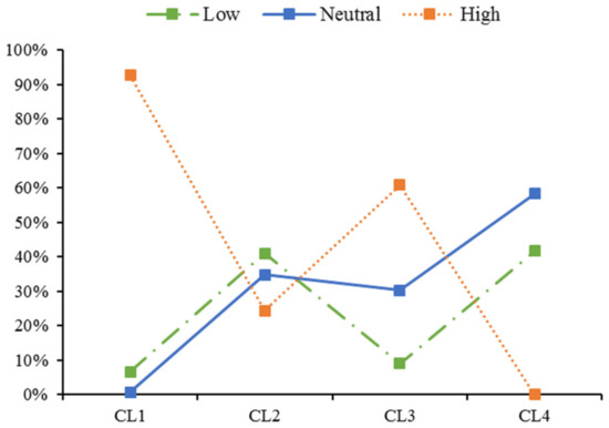 Figure 15 shows that CL2 travelers have the lowest evaluation of public transport waiting time, while CL3 travelers have the highest positive evaluation of public transport waiting time. CL1 and CL4 travelers’ evaluations of the public transport waiting time are mostly neutral and positive.