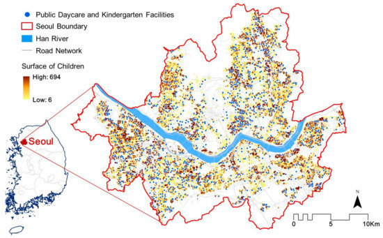 The study area is Seoul, the capital city of South Korea, and data is mainly from the 2015 census. In 2015, approximately ten million people lived in Seoul. Insufficient public services, including childcare, have been a chronic problem for Seoul. Since launching its infrastructure plan in 2011 [36], the municipal government has been expanding PDKs, with more than 200 PDKs established annually. In 2015, PDKs accounted for about 10% of all childcare services in Seoul. The initial goal of the infrastructure plan was for PDKs to account for at least 30% of all childcare services. There is a keen interest from the municipal government and the public in gaining a better understanding of where the PDKs are located across the city and how accessible the service is for various neighborhoods.