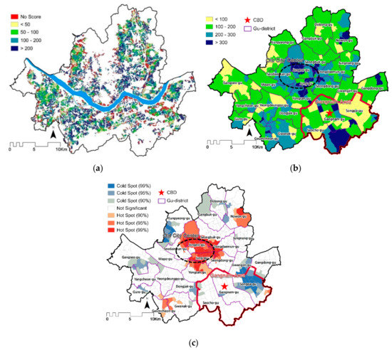 Spatial Accessibility of PDKs in Seoul: (a) 100 m × 100 m Cells, (b) Dongs, (c) Cold/Hot Spots.