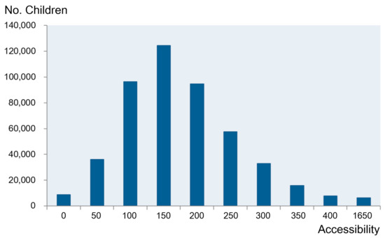 Based on the cell-level accessibility result, Figure 3 shows the frequency distribution of the spatial accessibility of PDKs in Seoul. It resembles a normal distribution with a relatively steeper slope on the left, as about 60% of children have below-average accessibility. The accessibility value is 0 for 1.8% of the overall children population (8637 children). In other words, no PDKs can be reached within 700 m for children in those cells. Additionally, 9.3% (44,632) of the children have accessibility below 50 (i.e., less than one-third of the average). In the meantime, 6.2% of children (29,678) enjoy the accessibility of more than 300 (i.e., twice or more than the average). The strong contrast between the haves and have nots is evident in access to PDKs in Seoul.