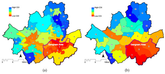 Figure 4a,b show the spatial patterns of CDI across the 25 MLR-constructed regions and the 25 Gu regions, respectively. A lower CDI value, labeled by a smaller number, corresponds to a higher socio-economic status in both maps. The two were largely consistent but differed in detail. Regions with higher CDI were found in the north, while the ones with lower CDI were in the Gangnam area and its adjacencies. Here we use region 8 in Figure 4a as an example to illustrate the value of the regionalization approach. It is known a greenbelt with a relatively low socio-economic status, where development has long been banned from controlling urban sprawls. It was detected by the MLR approach. By districting it into the three wealthiest Gu regions (labeled as 1, 2 and 3) in Figure 4b, its distinctive structure was smoothed out.