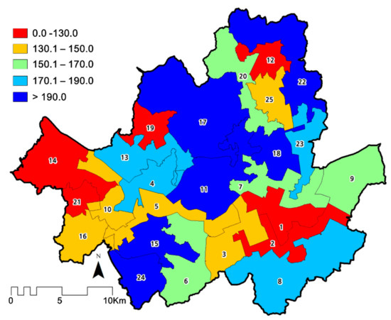 The results from the constructed regions were assessed by spatial compactness and attributive homogeneity. As a spatial compactness index, the isoperimeter quotient (IQ) is defined as the ratio of the area of a region to the area of a circle with the same perimeter as the region. The higher the IQ, the more compact a region is in shape. The homogeneity is defined as the coefficient of variation (CV). The lower the CV value of a constructed region is, the higher its homogeneity is. As shown in Table 1, spatial compactness was higher in the Gu regions (mean of IQ = 0.4358) than in the constructed regions (mean of IQ = 0.2317). The CV’s mean value of constructed regions was 0.3608, lower than that of Gu regions (0.4106), and thus constructed regions are more homogenous than Gu regions. The MLR method is designed to construct regions in such a way to enhance the attributive homogeneity, and thus indeed yielded a more favorable homogeneity measure in the generated regions. One likely explanation for more complex shapes in constructed regions is that the socio-economic coherence captured by the MLR is shaped more by Seoul’s physical environment (e.g., topography, waterways) and road network than the administrative Gu regions. The latter might also have been districted consciously to be compact to facilitate internal connections and distribute public resources and services. Please note that one may change the values of compactness and homogeneity for the constructed regions when adjusting their corresponding weights in the MLR analysis, and the case study adopted equal weights (50–50%).