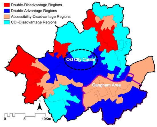 Figure 6 shows the four types of regions. The Double-Disadvantage Regions are found in the north and around the outskirts in the west, where the development has been halted for a long time. These regions should be placed with the highest priority for the municipal government to expand the provision of PDKs there. Providing public facilities preferentially to regions with a shortage of PDK facilities and low socio-economic status is desirable for promoting social equity. On the other side, the Double-Advantage Regions are mainly located in the south of the old city center and to the west and in the south corner of the Gangnam area. These regions are relatively weathy neighborhoods and enjoy good accessibility of PDKs, and therefore any additional placement of PDKs there should not be made without well-justified causes.