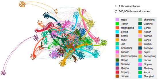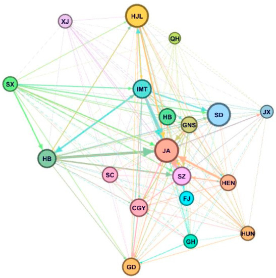 Figure 5 is a visualization of the embodied carbon emission flows among communities using OpenOrd algorithm in Gephi [25]. The nodes represented the communities, and the node size was decided by the within-community carbon emission flows. The edges represented the emission flows transmitted among communities. The color of edges was decided by the source node, the arrows pointed out transmission direction, and the width corresponded to the emission amount. It can be seen that some communities had more intensive interactions than others, which were put in the middle of the network, such as the Jiangsu-Anhui community. Some communities had less interaction, which were put on the periphery of the network, such as Qinghai community. In addition, some communities had significant outflows and inflows with other communities, which can be seen in the large arrows. The significant flows from the Hebei community to the Jiangsu-Anhui community was a good example.
