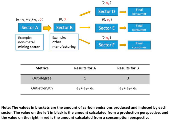 Figure 2 shows an example to demonstrate the importance of sectors with a high out-degree. The example in Figure 2 is not intended to draw out sectoral connections in the real economy, but to create a simple five-sector economy for demonstration. Suppose only sector A directly produces carbon emissions e during the whole supply chain. Only sector D, E, and F produce products that are used by final consumers, and they cause carbon emissions at the source by e1, e2, and e3 respectively. From the whole system perspective, the carbon emissions produced at the source should be equal to the carbon emissions caused by final demand, so e = e1 + e2 + e3. The values in brackets are the amount of carbon emissions calculated from a production perspective (left in black) and consumption perspective (right in red).