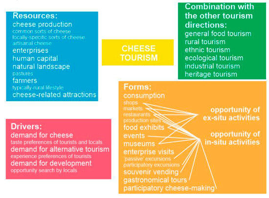 Similarly to how apitourism means bee/honey tourism [22] and enotourism means wine tourism [23], cheese tourism can be abbreviated as casetourism—‘caseus’ is a Latin word meaning ‘cheese’. The proposed term is used tentatively in the present study, although only time will tell whether it will be accepted by the international academic community. Cheese tourism seems to be a highly specific activity, but many aspects of it are frequently analyzed. The main findings are systematized below (the advice of literary overview and critical analysis [24,25] has been taken into consideration).