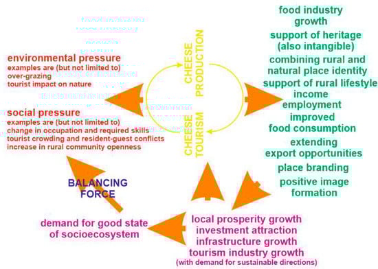 Two tentative, explanatory models can be proposed on the basis of the above. The first model characterizes cheese tourism in general (Figure 1). The second model traces the relationship of cheese tourism to both environmental sustainability [51,52,53,54] and socioeconomical sustainability [54,55,56] (Figure 2). First of all, it closely relates cheese production to cheese tourism itself. This pair generates both positive and negative effects. It is possible to find a balance between them via some more general positive consequences, the appearance of extra opportunities, and the facilitation of a proper understanding of local needs. For instance, when a local community (at a place of cheese tourism) obtains a higher quality-of-life expectation due to prosperity, this should facilitate the search for instruments to mediate negative environmental effects, e.g., implementing eco-innovations in agriculture.