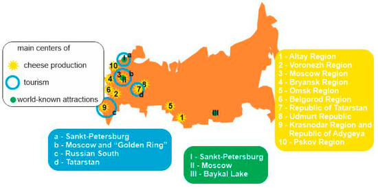 Cheese is produced in many Russian regions, of which 11 are the most important (Table 1). Enterprises in the Altay and Voronezh regions produce about a quarter of all Russian cheese. In eight regions, cheese production has increased substantially over five years (in the Pskov Region, it rose >1.5 times), and a decline took place in only the Republic of Tatarstan (Table 1). The majority of cheese-producing regions are located in the western part of the country, and two regions are situated in Southern Siberia (Figure 3). One should note that the majority of these regions do not boast significant tourist flows (Table 1), and thus, cheese tourism can be an advantage when attracting future visitors. Two territories, namely the Krasnodar Regions coupled with the Republic of Adygeya and the Moscow Region, are more attractive to visitors, and casetourism can contribute to diversification of the available tourism services there. Moreover, it is important that the main cheese-producing regions are located close to important tourist destinations and even coincide with these (Figure 3). Taken together, this evidence implies high cheese tourism potential in some parts of Russia.