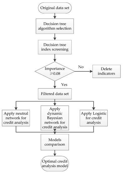 Our paper applies the tool of a decision tree to initially screen the indexes and evaluates the credit through the composition algorithms based on the characteristics of AI credit models and e-commerce platform sellers. Among them, frequently used decision tree algorithms include CHAID, CART, Quest and C5.0. By comparing several decision tree models, the model with the highest accuracy is selected to streamline the index system, followed by using simplified indexes for analysis. The data set selected by the decision tree is combined with an AI algorithm to form a combined model. Through comparison and screening of different models, the adopted combinatorial algorithms consist of the decision tree—ANN, decision tree—DBN and decision tree—LR. The specific process is shown in Figure 1.