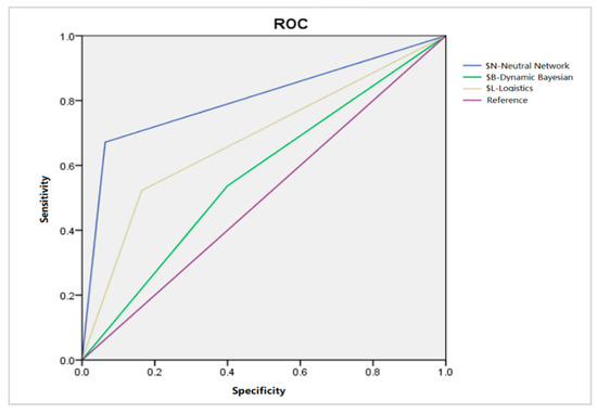 It can be seen from the graphs that the prediction accuracy ratio of a decision tree—ANN is higher than the other two methods. At the same time, the running result data was plotted as the ROC curve, as shown below (Figure 4), and the AUC value was obtained. The AUC value of ANN, DBN and Logistics are shown in Table 8, and it is concluded that the AUC value of ANN is significantly higher than that of DBN and LR.