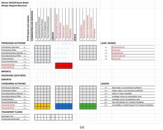 The ILUTM diagram structure of PECAS: (a) grouping households into only two categories; (b) grouping households into 18 categories.