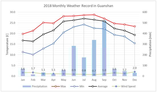 The collision of the Eurasian plate and the Philippine Sea plate created the Central Mountain, the Coastal Mountain, and the in-between Huatung Valley. Guanshan (120° E longitude, 23° N latitude) is approximately 225 m above sea level. The average temperature is 27 °C in July and 16.7 °C in January. On a daily basis, the daytime temperature can reach above 35 °C in summer, while the nighttime temperature can drop below 10 °C in winter. The annual precipitation, mostly concentrated from July to October, is approximately 1800 mm. The average wind speed is higher in winter (close to 2 m/s) and lower in summer (less than 1 m/s) [38]. The specific topography results in a hot and humid climate pattern with a higher degree of fluctuation (Figure 2).