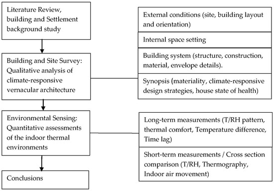 The comparative study was carried out in two folds: (1) Qualitative analysis based on conventional building survey, and (2) Quantitative assessments of the indoor thermal environments by environmental sensors (Figure 3).