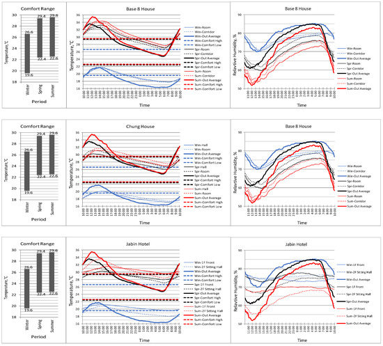 For the relative humidity levels of the three houses, the Base 8 house has the lowest humidity, and the Chung house has the highest humidity for all three seasons. The results correspond well with the openness of the Base 8 house and the closedness of the Chung house building envelopes (Table 6).