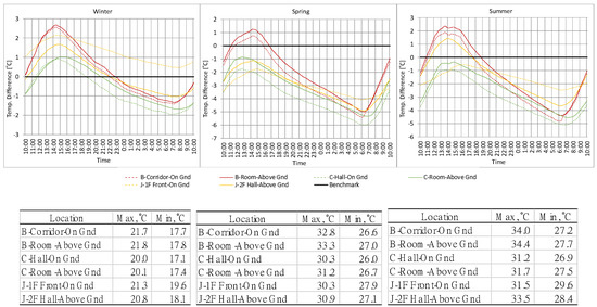 For cross comparison, in the morning, the Base 8 house northern elevation and the Jabin hotel east elevation in summer and the Base 8 house and Jabin hotel east elevations in the spring have the highest surface temperatures of the respective buildings. Both of the buildings are exposed to an open field. In the afternoon, the Base 8 house western elevation and Jabin hotel southern, eastern, and northern elevations have the highest surface temperatures in the summer. In the spring, the Base 8 house northern and eastern elevations and the Jabin hotel eastern elevation (cloudy at the time of measurement) have the highest surface temperatures of the respective buildings. In the early evening in summer, the Base 8 house western elevation has the highest surface temperature, and there is no large difference seen in spring. Among the three buildings, the Chung house has the smallest indoor-to-outdoor surface temperature difference.