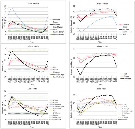 Short-term measurements were aimed to extract the characteristics of the individual building components. For a period of one month, the Base 8 house and Jabin hotel were installed with additional HOBO sensors to record the temperature/RH fluctuations in multiples spaces. For the Jabin hotel, the measured spaces include the ground floor hallway, second-floor landing, balcony, a single room, Japanese rooms, the attic in the rear building, and the hallway in the front building. For the Base 8 house, the spaces include the hallway, living room, crawl space, attic, and outdoor shaded porch. For the Chung house, the measured spaces are the same: main hall, bedroom, and shaded outdoor area.