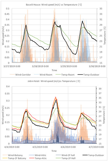 For the detailed thermal performance analysis, two-week continuous measurement data of indoor air temperature and relative humidity of multiple spaces from 21 March 2019 to 3 April 2019 were extracted. Figure 6 shows the average values of data from 25 March 2019 to 31 March 2019. Week-long multiple-spot air movement monitoring was conducted in the Base 8 house and then in the Jabin hotel. Figure 7 shows the wind speed in three days during this period. In additions, two batches of infrared thermography spot measurements were taken on 1 August 2018 and on 2 April 2019 (Table 9). The purpose of taking detailed measurements is to create the space-to-space “cross section” views of the thermal performance of the three buildings.