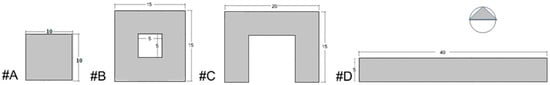 In this study, four types of building forms were considered in order to investigate the impact of the form of the office building on the amount of cooling and heating energy consumption in Shiraz, Tabriz and Bushehr [,]. The forms are from archetype patterns which are among conventional forms of office buildings []. According to Figure 2, the first form is singular, the second form has a central courtyard, the third form is the U and the fourth form is linear. The forms are named with #A, #B, #C and #D characters, respectively. As it is obvious in Figure 2, the first form is 1000 m2 and the next three forms are equally 2000 m2. In order to compare the cooling and heating loads of the buildings, these values are expressed in terms of square meters (m2). In this research, four forms of office buildings are studied in three different modes, two story, four story and six story modes; these are the most common modes for constructing office buildings [].