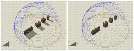 For the purpose of simulating the energy and natural lighting of the buildings, the DesignBuilder software [] was utilized. The DesignBuilder software is one of the most powerful softwares in the realm of simulating building energy. Additionally, the Plus Energy Analysis Engine was used in order to simulate the building energy and radiance engine for natural light analysis. This software is capable of considering all of the detailed aspects of the building and for each city, with different climates, simulations can be conducted per hour through various time intervals. For instance, Figure 3 indicates the solar graph of a six-story building in Bushehr, which was simulated two times, once on June 21 (Summer Solstice) and another time on December 21 (Winter Solstice) at 12:00 p.m. Due to the small difference between the solar graphs of the studied cities, only the diagrams of Bushehr are represented as samples. In order to simulate the selected forms, at first, the climate data of the studied cities were collected from the Meteorological Organization for the period of 2006–2016 and then they were inputted into the DesignBuilder software separately for each city; Afterwards, separate EPW files were created to ensure that the data are sufficiently valid.