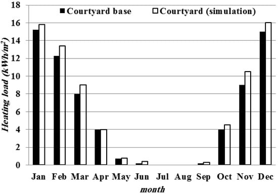 Comparison of the heating loads of the building of the central courtyard form for the base mode [] and simulated mode in order to validate the data.