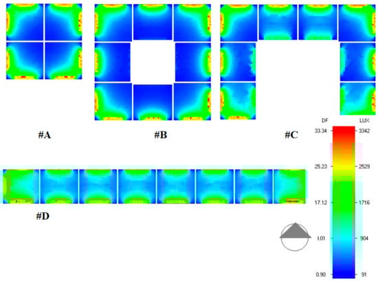 Daylight has a crucial role in office buildings in terms of energy consumption, lighting, cooling and heating. In Figure 5, the daylight is illustrated in the four different forms. The radiance represented by the DesignBuilder software was used in order to analyze the daylight. Figure 5 shows the daylight value at an altitude of 0.75 from the surface of the earth, which is represented as the height from the ground according to the ASHRAE standard. As shown in Figure 5, the #D form receives the highest amount of the light, due to the fact that it has the largest facade in the south. Also, after the linear form, the U form shape possesses the most direct and diffuse light. Meanwhile, the central yard shape has caused the building to receive direct light from the outside, in addition, from the inside of the central courtyard, light enters like it is diffused into the office rooms.