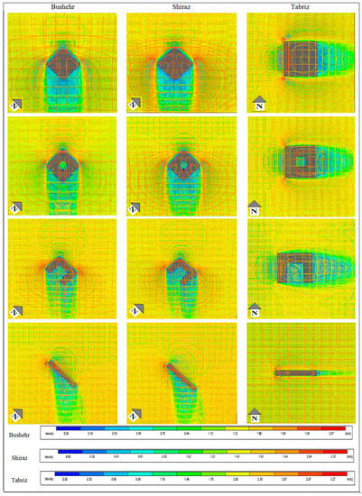 Knowing the shape of the wind flow when it is striking the building, can help us to understand the energy consumption of the inside of the building. When a part of the building is exposed to the wind during cold months, it causes an increase of heat loss at the walls, and during the hot months, it increases the cooling load of the building []. Figure 6 demonstrates the shape of the wind flow when it meets the studied building forms for different cities. For each individual city, the wind speed and wind direction were calculated with the assistance of numerical calculations; Accordingly, the annual average velocity and prevailing wind direction were calculated too. The prevailing wind direction in Bushehr is north-west with a speed of 2.5 m/s. The prevailing wind for Shiraz is also north-west with a speed of 2.2 m/s and for Tabriz the prevailing wind direction is west with an average speed of 3 m/s.