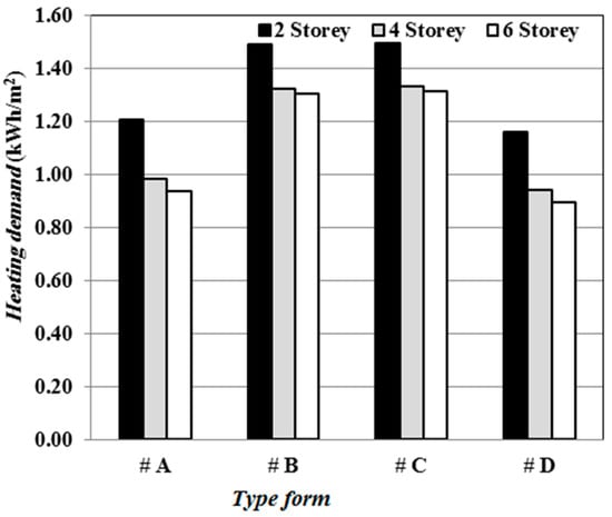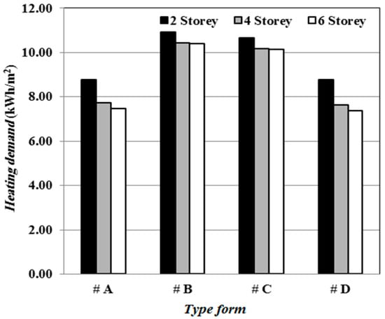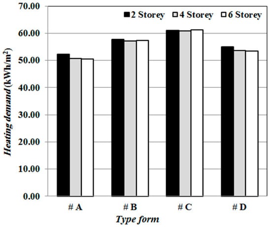 Figure 15 illustrates the average heating energy per square meter regarding the forms for Tabriz during a year. As shown in Figure 15, the single form and central courtyard form in all modes consumed the least amount of energy for heating. This is because they have the highest amounts of exterior exposure to sunlight. The other forms, from the lowest to the highest, are the central courtyard form and the U form.
