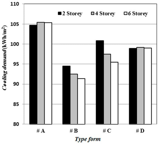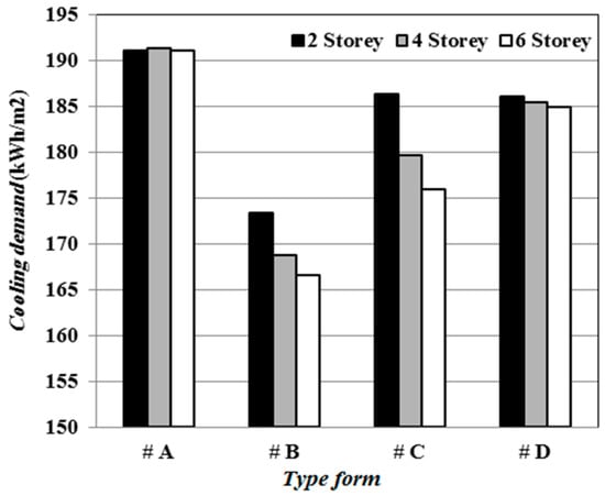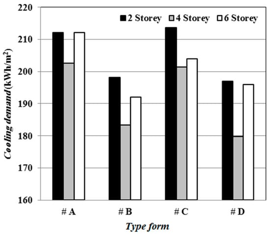 The annual cooling consumption of the office buildings of Bushehr is illustrated in Figure 8. As shown in Figure 8, the linear form among the other forms of the two-story modes, has the lowest energy consumption from the aspect of cooling load, and then the central courtyard form, the single form and the U form have the lowest energy consumptions, respectively. In four-story building mode, the lowest energy consumption for cooling load belongs to the linear form, central yard form, U form and single form. In the six-story mode, the central courtyard form has the least energy consumption from the aspect of cooling load, and then there take place the linear form, U form, and single form, respectively.