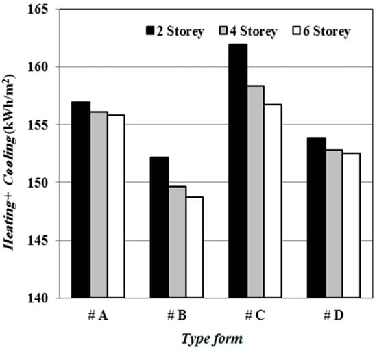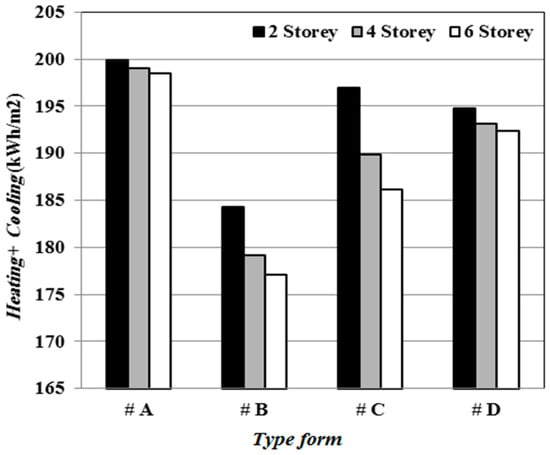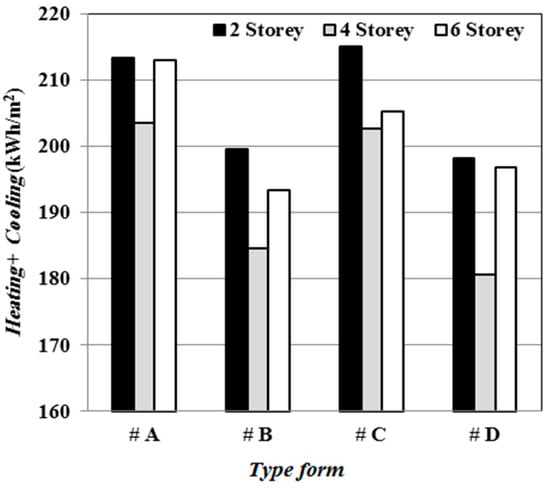 The total cooling and heating loads per square meter, for all building forms in Bushehr are shown in Figure 9. According to Figure 9, among the building forms through the two-story modes, the linear form has the lowest energy consumption, and then the central courtyard form, single form and the U form, in ascending order. Among the four-story building forms, the energy consumption from lowest to the highest belongs to the linear form, the central courtyard form and the U form. Additionally for the six-story building, the central courtyard form has the least energy consumption and afterwards from lowest to the highest, is the linear form, the U form and the single form.