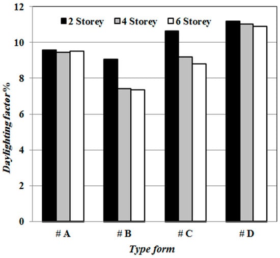 Figure 18 shows the average amount of natural daylight among all building forms in Tabriz during the year. According to Figure 18, the linear form receives the maximum natural light due to the fact that the highest external surface of the building is on the southern facade, and its east-west direction has resulted in the highest amounts of light (Figure 5), and in all cases, the central courtyard form receives the lowest amounts of light. Meanwhile, among the two-story buildings, after the linear form is the U form and the single form, from the aspect of obtaining more light and thus more decent functions. In the four-story buildings, the U form gains 4% more lighting than the linear form. In addition, in the six-story building, the single form receives 8% more natural daylight than the U form.