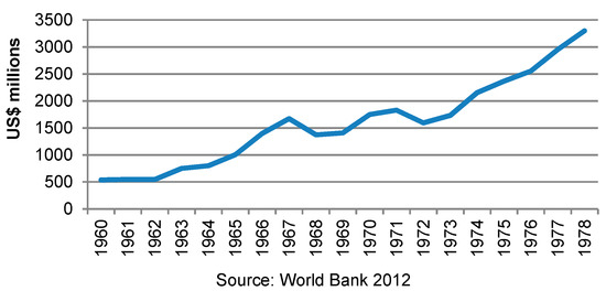 Most of the foreign aid was used to construct basic infrastructure for promoting economic development, and included the building of transportation networks, irrigation systems, electricity grids, etc. These facilities improved the capacity for production in both the agricultural sector and industry. The Afghan government generated revenue through taxes on agricultural exports. Consequently, the income of private and state-owned enterprises (SOEs) increased, which led to sustainable development in Afghanistan [28,29,30] (Dr. Amin Farhang: a professor of the Afghan economy). As can be seen in Figure 1, the economic status of Afghanistan was stable and sustainable. Ostensibly, the gross domestic product (GDP) was strong, but real economic growth was low.