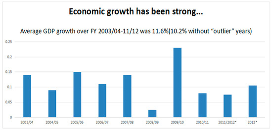 After the 9/11 attack, the immediate actions of the U.S. military and other international forces overthrew the Taliban regime. The period of violence and warlords was ostensibly terminated, which led to peace and the preconditions for internal economic growth. Three million Afghans who lived abroad returned to Afghanistan with their assets after 2001, and around 600,000 exiled people returned home and repossessed their land [32]. The international communities provided billions of dollars in foreign aid to assist Afghanistan in rebuilding its society. Since 2001, the Afghan government has received USD 78 billion in foreign aid from international contractors and donors [33]. As Figure 2 shows, the economic status of Afghanistan developed strongly during this period. In 2003, Afghanistan’s GDP was only USD 4.1 billion, but it reached USD 12.5 billion in 2009 [34].