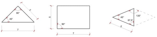 Among the bibliographical references on the muqarnas, two manuscripts on carpentry from 17th century should be mentioned: the ones by Fray Andrés de San Miguel [5] and Diego López de Arenas [6]. These authors explain how to geometrically build the plan from three geometrically flat shapes (Figure 1); a rectangle with ratio 5 to 7 (rounded to 5 root of 2), an isosceles right triangle composed of two cathetus of 5, and a hypotenuse of 7 (also rounded) and an isosceles triangle with 45° angle and longer sides of 5, making possible to combine the last one with an identical symmetrical triangle pivoting on the shortest side. Theoretically, the layout of the muqarnas’ inner angles are reduced to four: 45°, 67.5°, 90°, and 135°. Taking into account that muqarnas follow the patterns produced by those angles, it is possible to identify whether if they are deformed with respect to their original shape.