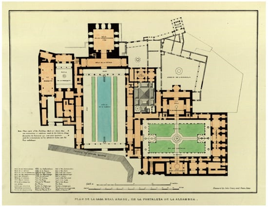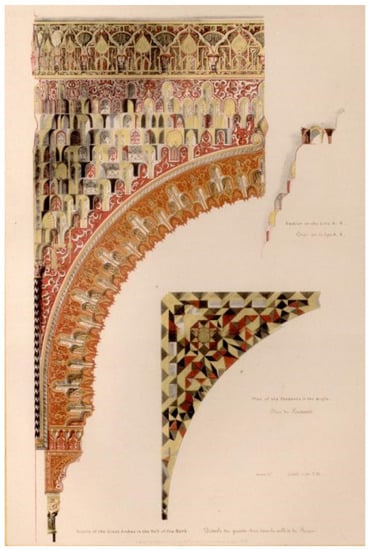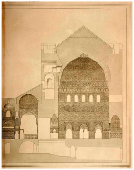 - Goury, J.; Jones, O.; de Gayangos, P. Vol I. Plans, Elevations, Sections, and Details of the Alhambra, from Drawings Taken on the Spot in 1834 by Jules Goury, and in 1834 and 1837 by Owen Jones; Owen Jones: London, UK, 1842. [Google Scholar]