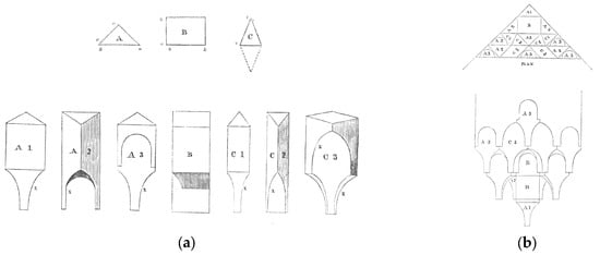 Together with the previous text, Jones and Goury provided both a schematic diagram and elevation drawings from the three basic shapes (triangles and rectangles), the seven muqarnas pieces, and primary combinations among them (Figure 5).