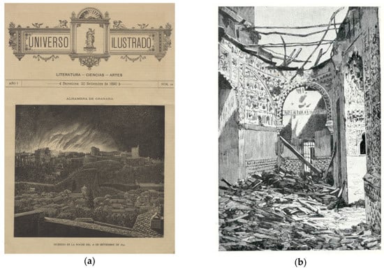 - Valladar, F.P. El Incendio de la Alhambra; Imp. y Lib. de la Vda. é Hijos de P.V. Sabatel: Granada, Spain, 1890. [Google Scholar]
