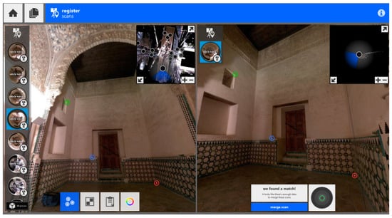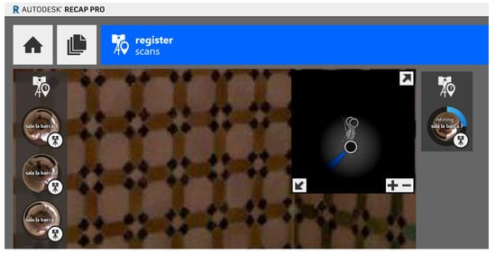 Figure 7 shows an example of point cloud registration: the left image shows the scans already registered, and the right shows a scan about to be registered (StR). The image on the left corresponds to the reference scan (RS). The panoramic images of RS and StR had common areas where we could identify homologous points. Three homologous points were selected (each homologous point had the same color in RS and StR) and Recap computed the transformation matrix of an approximated StR register using those three homologous points. The software provided a graphic indicator about the quality achieved by the approximated registration process: the right image in Figure 7 shows a grayscale circle with an inner circumference; the circumference color can be green, yellow, or red indicating that the approximated registration was good, suitable, or bad, respectively. If we accept the approximated registration Recap proceeded to refine the adjustment using an iterative closest point (ICP) algorithm: some examples from ICP can be found in Sharp et al. [19] and Pormelau et al. [20]. Figure 8 shows the instant of ICP refinement of Recap after accepting the approximated registration (right upper corner).